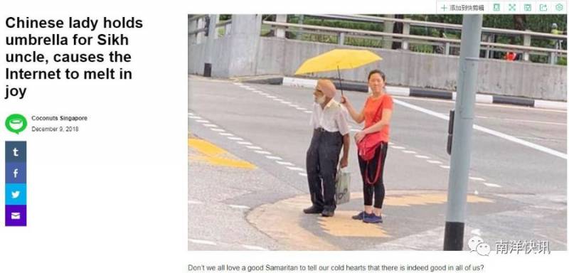 在新加坡的一个交通路口处,一名中国女性和一名印度锡克教徒打扮的老者正在等红灯。彼时,天上突然下起了倾盆大雨,而这名老者并没有带伞。旁边的那名中国女性主动为老者撑起了伞,而她自己整个身子几乎都暴露在了大雨中。