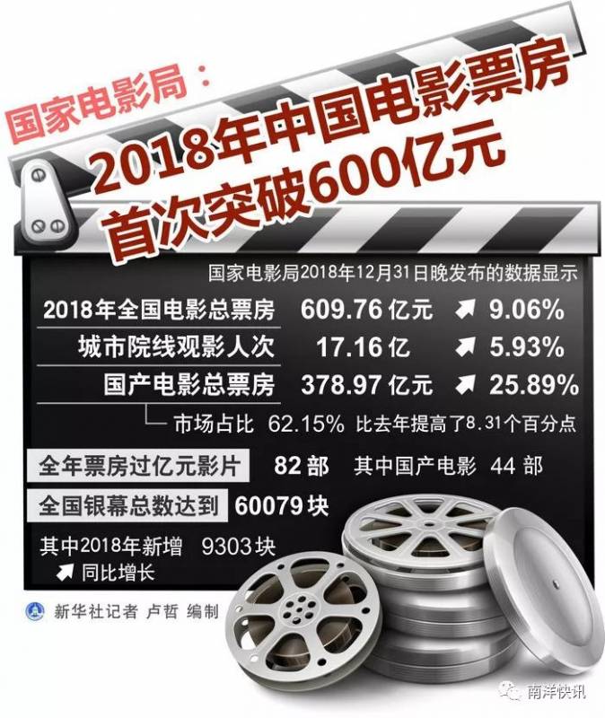 国家电影局2018年12月31日晚发布的数据显示,当年全国电影总票房为609.76亿元,同比增长9.06%,城市院线观影人次为17.16亿,同比增长5.93%;国产电影总票房为378.97亿元,同比增长25.89%,市场占比为62.15%,比去年提高了8.31个百分点,市场主体地位更加稳固。