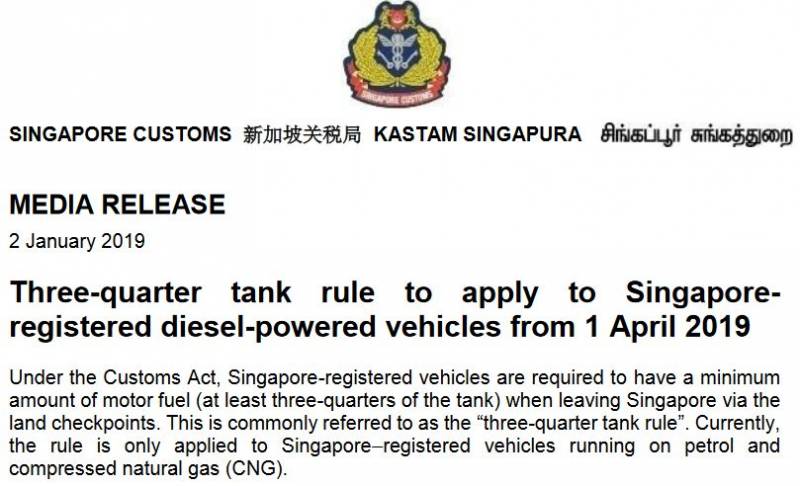 新加坡关税局(Singapore Customs,SC)昨天发布公告,宣布从今年4月1日起,新加坡注册的柴油车出关时,必须打满至少四分之三缸的柴油,否则将面对罚款。