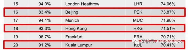 中国的北京首都国际机场准点率排在16,香港赤鱲角国际机场为18名,马来西亚首都的吉隆坡国际机场也入了榜,为第20名。