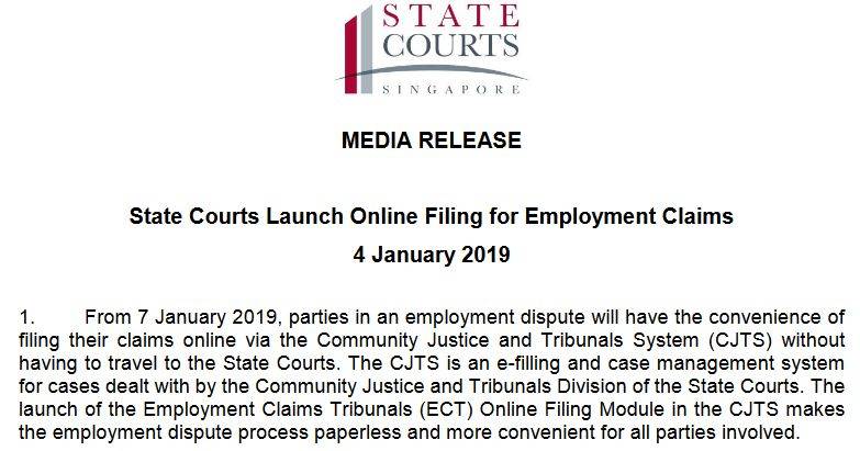 新加坡国家法院(State Courts)今天发布公告,从下个星期一(7日)起,遇上雇佣纠纷的人可上国家法院设立的“社区司法审裁系统”索偿,无须亲自到法院办手续。
