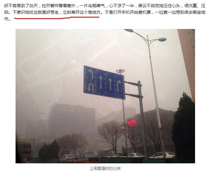 一位在北京读书的学生,没办法逃离:“来北京以后,窗外总是通宵达旦的雾霾,我的肺被杂质污染了,最近很多人在朋友圈怨声载道,甚至因为雾霾打算移民。。。。。。”