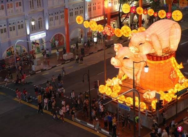 这个高9.5米的大型猪年灯笼是牛车水农历新年灯饰的亮点之一。(取自联合早报)