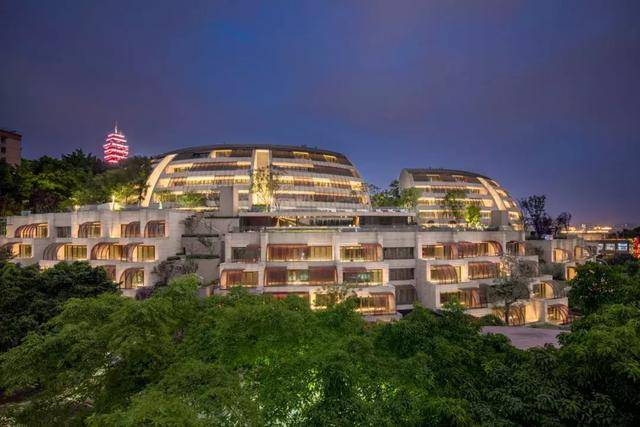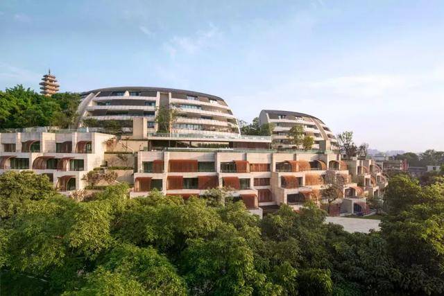鹅岭峯横亘在鹅岭山最高的高原上,临近著名的鹅岭公园,俯瞰渝中半岛和重庆的中心点长江。6万平方英尺(约42735平方米)的开发项目包括126个公寓,组织成阶梯状,呼应基地的斜坡。建筑的类型随着山坡的上升而变化,从几个阶梯布局到山顶的一对独立的圆顶别墅。地形带来的设计灵感可以从住宅的向上弯曲和独立建筑的阶梯式组织中看到,提供了所有公寓不间断的周边景色。