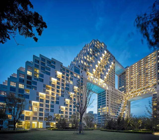 秦皇岛金梦湾被设计为高密度的滨海居住社区。设计利用一系列堆叠的垂直建筑模块,建造出处处有平台和花园的多孔楼体结构。建筑群沿着海岸呈阶梯形排列,形成了巨大的城市之窗,如同将优美的风景装进画框一般,给人一种开放的感觉。颇有经典的Habitat 67的影子。