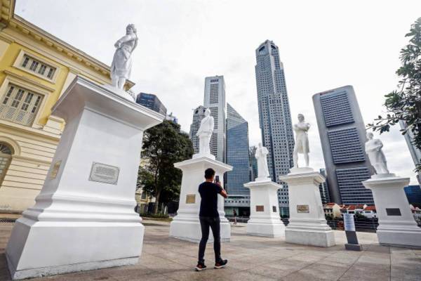 新塑像由新加坡开埠200年工作组委托制作,将伫立在新加坡河畔莱佛士登陆点直到下周二(8日),之后会全年在新加坡河畔不同地点展出。