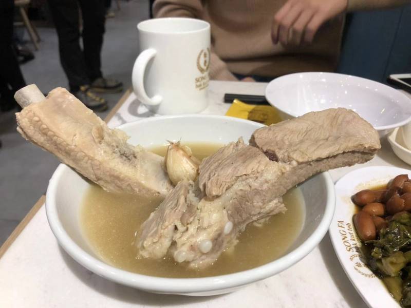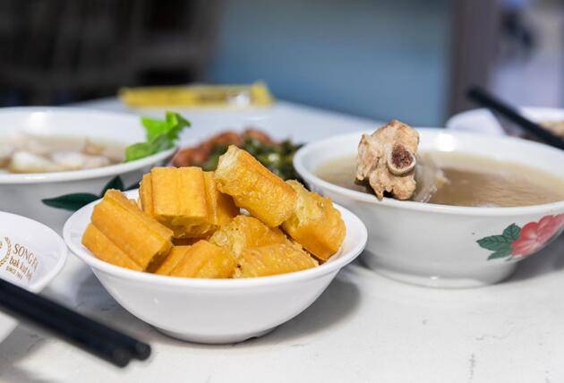 在松发,按照传统吃肉骨茶的习惯,必须带有一定的仪式感。一碗热腾腾的肉骨茶端上,必然要配一碟油条,吃的时候把油条浸泡在肉汤里,一口咬下,肉香、脂香、胡椒香顿时充满口腔,别有一番酣畅淋漓的滋味。桌上同时还有一两道小菜,炖得软糯非凡的花生或酸中带微甜的咸菜,它们则是老饕们的必点曲目;接着来几份卤味,卤猪脚,焖凤爪或卤大肠,焖炖后浓浓卤味但又不腻,符合现代人对饮食的需求。结束时配上一杯茶,消食解油。所以,一份潮州式肉骨茶,一定是终于一杯功夫茶,这就是肉骨茶的文化。松发坚持到今天,并且坚信还会一直传承下去。