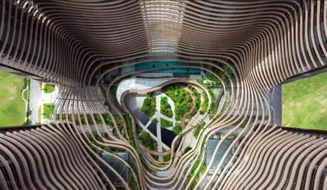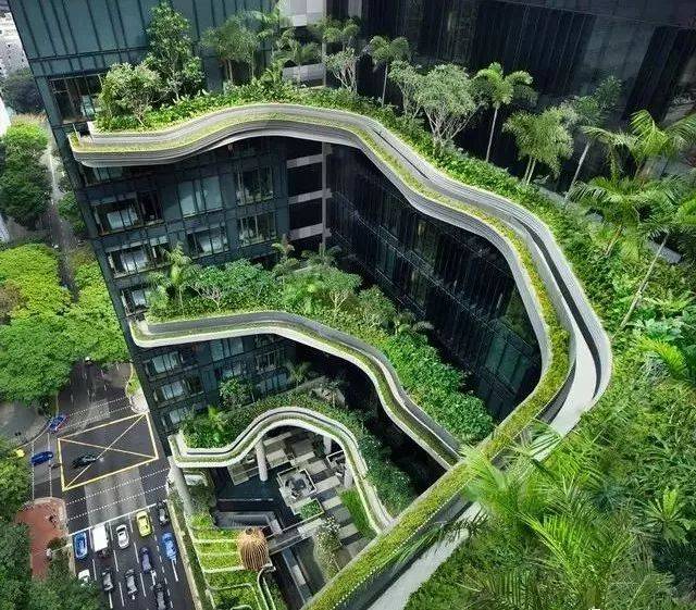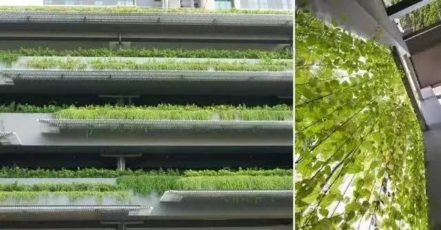 WOHA所设计的Oasia酒店耸立在新加坡高楼云集的中央商务区之中,而无论室内亦或室外空间,景观的用途被进一步扩展,成为了立面建筑材料中不可或缺的一部分。在鲜红的铝制金属网的映衬之下,21种攀缘植被的显得青翠欲滴,五彩缤纷的花果夹杂其中,为鸟类与昆虫提供了充沛的食物。
