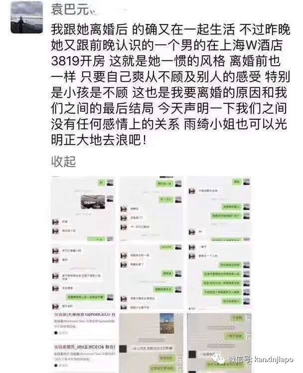 今天(1月6日),袁巴元在朋友圈爆料,和张雨绮离婚后,俩人还生活在一起。并且称前妻和刚认识两天的新加坡男人开房~