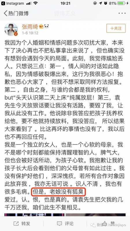 就在吃瓜群众纷纷猜测对话真假时,张雨绮做出了官方回应......对话截图属实,但是张雨绮表示“老娘没有狐臭”!(也是相当爱美了)