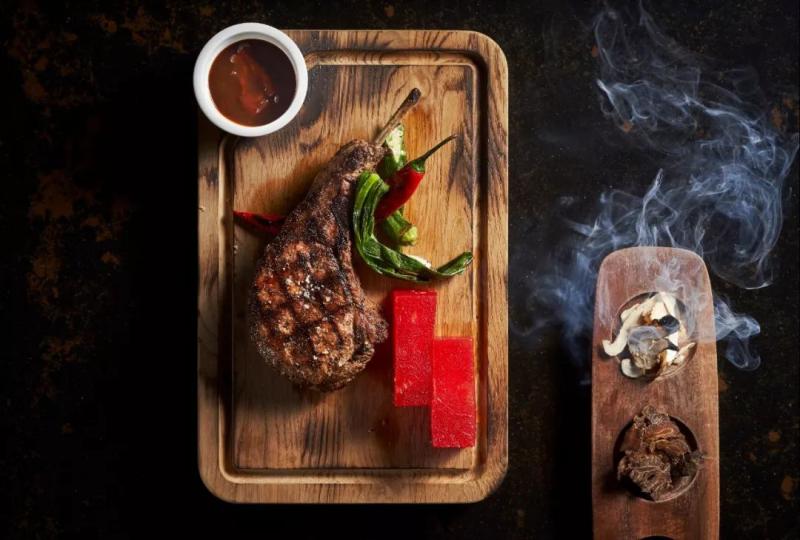 澳洲肉骨茶猪排佐西瓜、当归与烧烤酱 (Chargrilled “Bak Kut Teh”Pork Chop with Compressed Watermelon, Angelica, Barbecue Sauce), S$38:没有汤的肉骨茶你见过没?以8种药材静心腌制12个小时,细嫩的烧烤猪排搭配加入当归酱汁,肉骨茶味的烧烤酱点缀其中,地道的马来西亚风情一定让你赞不绝口,吃完后来一块烤西瓜醒醒嘴巴,完美!