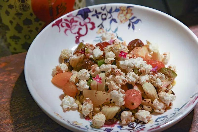 港式八珍醋玉米三吃、祖传番茄与黄瓜(Three-style Corn,Heirloom Tomatoes and Cucumbers in Hong Kong “Pat Chun” Sweet Vinegar ), S$18:这道色拉看来简单,其实味道非常地好吃。以焦香的小玉米和爆米花搭配混合在一起,口感非常的有趣,再加入了非常有层次感的八珍醋,健康又美味,味道别具一格的好吃!