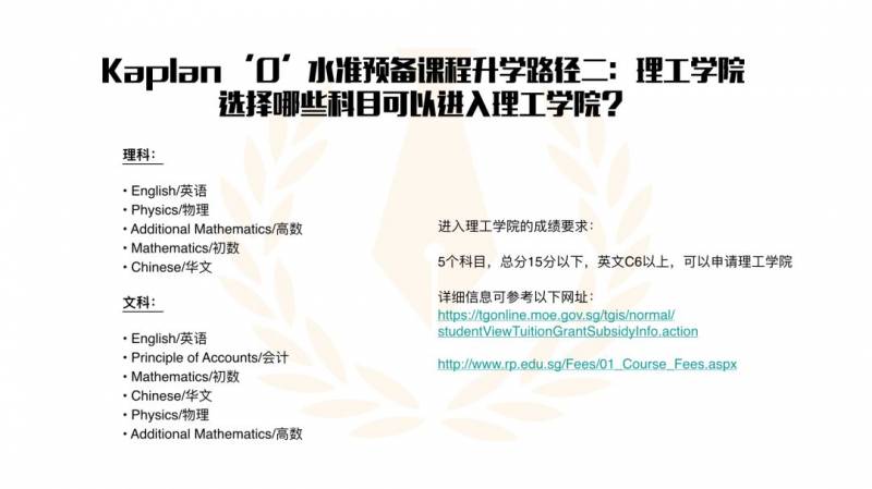 因为O水准考试的科目非常多,不同的考前培训学校也会提供不同的培训课程给学生。而且,学生对于未来的升学规划也不尽相同——有些想进入理工学院,有些想就读初级学院。学校也会针对学生的升学需求,设计不同的课程。我们就以新加坡Kaplan楷博高等教育学院为例。