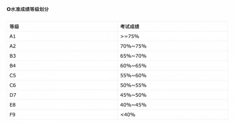 O水准考试成绩以A1、A2、B3、B4、C5、C6、D7、E8、F9等九级表示,C6级为合格。A1为1分,A2为2分,如此类推,分数越少代表考生越优秀。