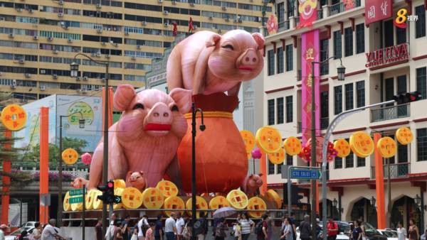 牛车水的“猪大哥”灯饰。(取自8频道时事及新闻网)