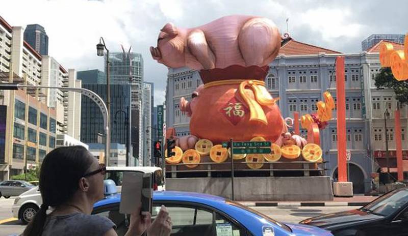 配合猪年,牛车水今年展出近180个以小猪为造型的灯饰。其中,坐落在余东旋街和克罗士街上段(Upper Cross Street)的交界处、一组9.5米高、7米宽的小猪造型巨型灯饰格外抢眼。