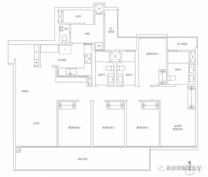 五卧室户型方方正正,所有房间均配备内置衣柜。厨房相对独立,还有储藏间及小庭院。餐厅与客厅共配备阳台。这种房型特别适合有3个或以上小孩的夫妻,或与父母同住的大家庭以及出租给相关高端专业人士。