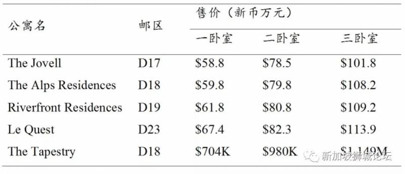 让我们在看看目前被普遍认为在价位上最具竞争力的5栋新公寓,它们是The Jovell、The Alps Residences、Riverfront Residences、Le Quest和The Tapestry。其中The Jovell公寓售价最低,一至三卧室的售价分别为S$58.8万、S$78.5万和S$101.8万。从目前聚宝园的预估价位看,聚宝园的售价将具有更高的竞争力。