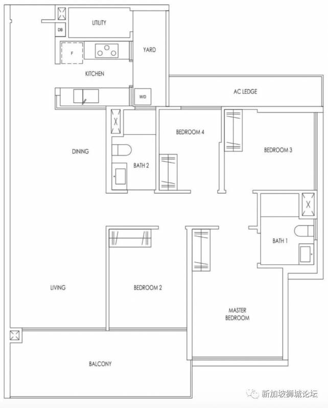 四卧室户型方方正正,所有房间均配备内置衣柜。厨房相对独立,还有储藏间,餐厅与客厅共享空间,客厅和其中一间普通房配备阳台。这种房型特别适合有3个小孩的夫妻,或与父母同住的家庭以及出租给相关高端专业人士。