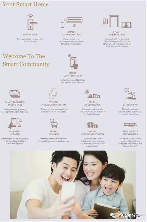 公寓还配备智能社区系统。每位居民均可安装社区智能手机应用程序。通过这个程序,您可以预定便利设施和场所。您可以通过这个系统通知您的朋友或访客从侧门或正门进入公寓或您家。您也可以使用社区的WiFi网络服务,进入24小时无间断的健身房和洗车位预定。您也可以利用这个程序查看附近的巴士到点时间。公寓还设有包裹收集站,居民也可利用这个应用程序在方便的时间段收取包裹。此外,公寓还配备来往淡滨尼地铁站和樟宜机场的免费穿梭巴士,居民可以利用该应用程序查看穿梭巴士的时间表。