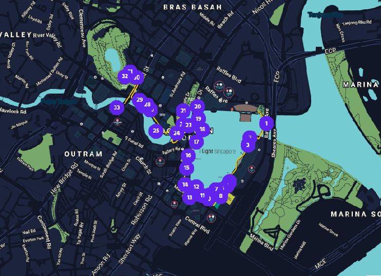 灯光映射成新加坡地图,就像在夜间从飞机上看新加坡一样。通过特别的动画效果,让游客了解新加坡100年的成长,了解新加坡是如何成为如今的国际枢纽。