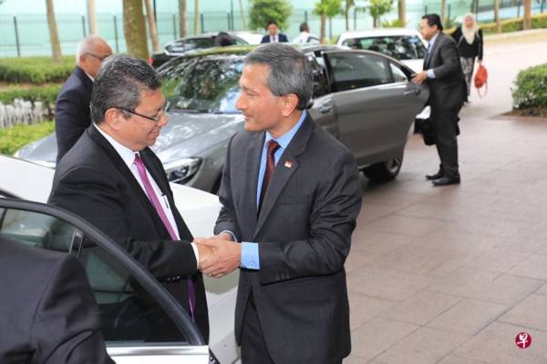 大马外交部长赛夫丁(左)抵达新加坡外交部总部,获维文迎接。(唐家鸿摄)