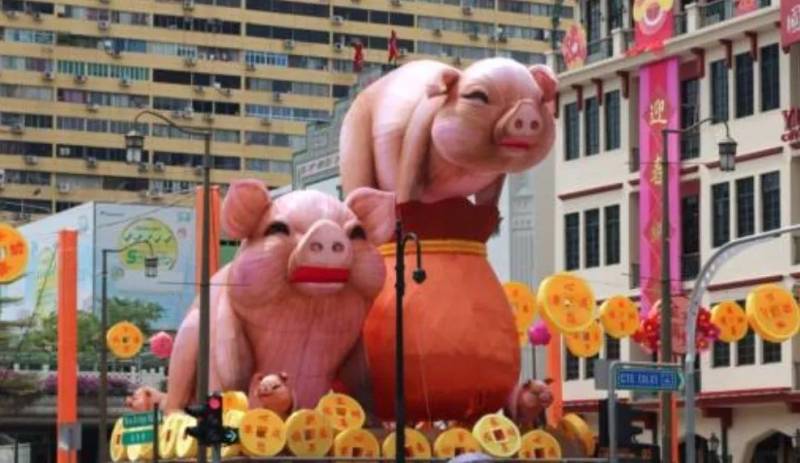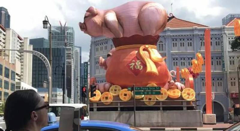 牛车水今年的“猪大哥”灯饰被公众批为脏猪、炖猪,缺乏农历新年“除旧迎新”的气息。配合猪年,牛车水今年展出近180个以小猪为造型的灯饰。其中,坐落在余东旋街和克罗士街上段(Upper Cross Street)的交界处、一组9.5米高、7米宽的小猪造型巨型灯饰格外抢眼。虽然距离亮灯仪式还有约两个星期时间,但装置工作近乎完成。