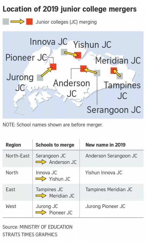 教育部于2017年4月宣布合并八所初级学院,合并后的JCs将使用两所学院的原名称,较老的一所学院名称排名在先。