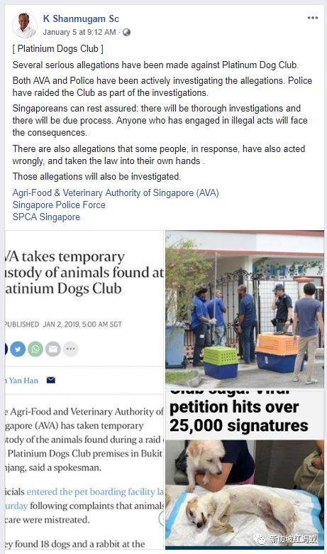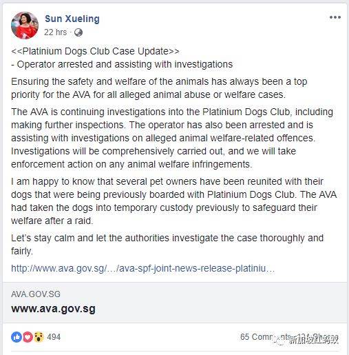 消息由内政部兼国家发展部高级政务次长孙雪玲昨晚在面簿发布。她说,农粮与兽医局(AVA)目前仍在调查那家宠物寄宿中心,部分曾寄宿在宠物寄宿中心的狗已与狗主团聚,其余还未认领的狗,农粮兽医局也将暂时看顾。