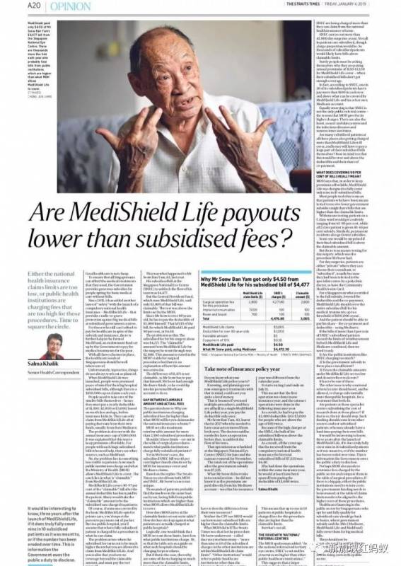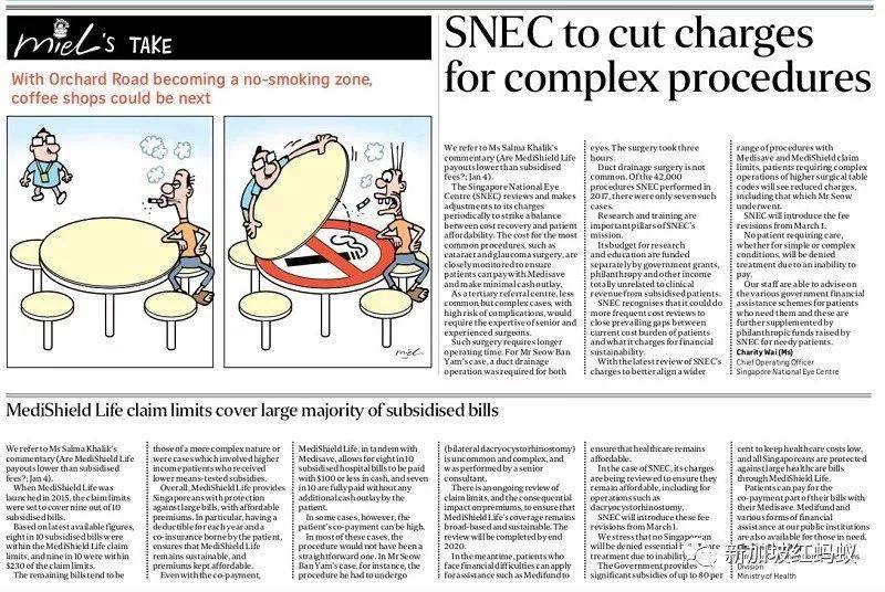 广告《海峡时报》资深医药线记者Salma Khalik将萧老伯的案例在2018年最后一天报道后,1月4日又撰写了长长的一篇评论解释终身健保(MediShield Life)计划目前的不足之处,引发网上热议,自然也引起有关当局关注。全国眼科中心和卫生部各自投函到《海峡时报》言论版回应Salma的文章,两封信函今早同时刊登在《海峡时报》。