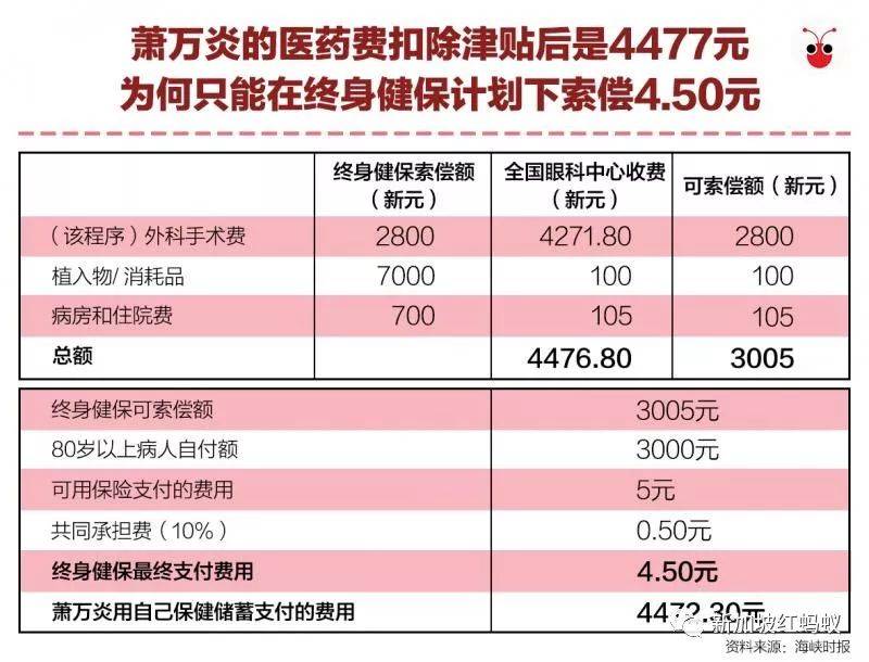 终身健保计划会根据病人的年龄来扣除介于1000元至3000元的自付额后才进行索偿。年龄在80岁以上的病人的自付额是3000元。萧万炎在进行手术时年龄已超过80岁,因此自付额是3000元。