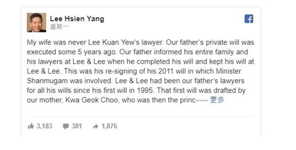 他在贴文中称,自父亲在1995年立下第一份遗嘱以来,李及李律师事务一直担任李光耀的律师,而非林学芬。
