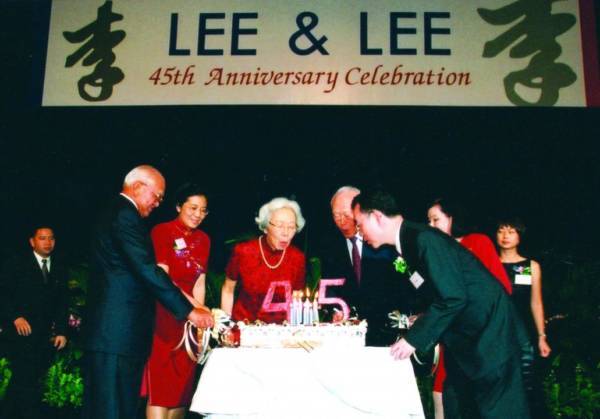 建国总理李光耀(右二)在1955年和妻子柯玉芝(右三)及弟弟李金耀创办李及李律师事务所。图为李光耀伉俪出席李及李律师事务所成立45周年庆祝会。(Lee & Lee)