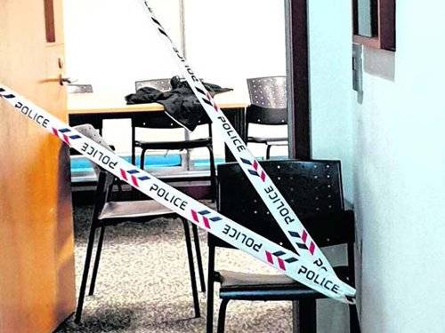 新加坡管理大学一间课室外拉起了警方的封锁线。(新报)