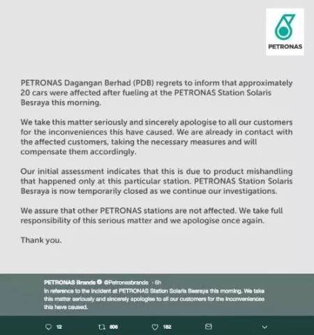 对于这个问题马来西亚国家石油公司可谓是反应迅速啊!通过Twitter回复称:已经得知,在马来西亚国家石油公司的Solaris Besraya加油后,大约20辆汽车受到影响的事情。
