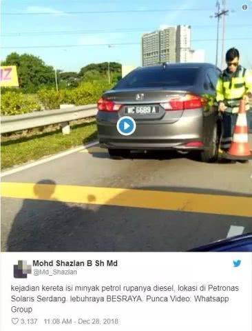事情发生在去年的12月28日,一位Twitter的用户发文表示,在马来西亚国家石油公司的Solaris Besraya加油站加油后,在sungai-besi高速公路上大约20辆汽车抛锚。