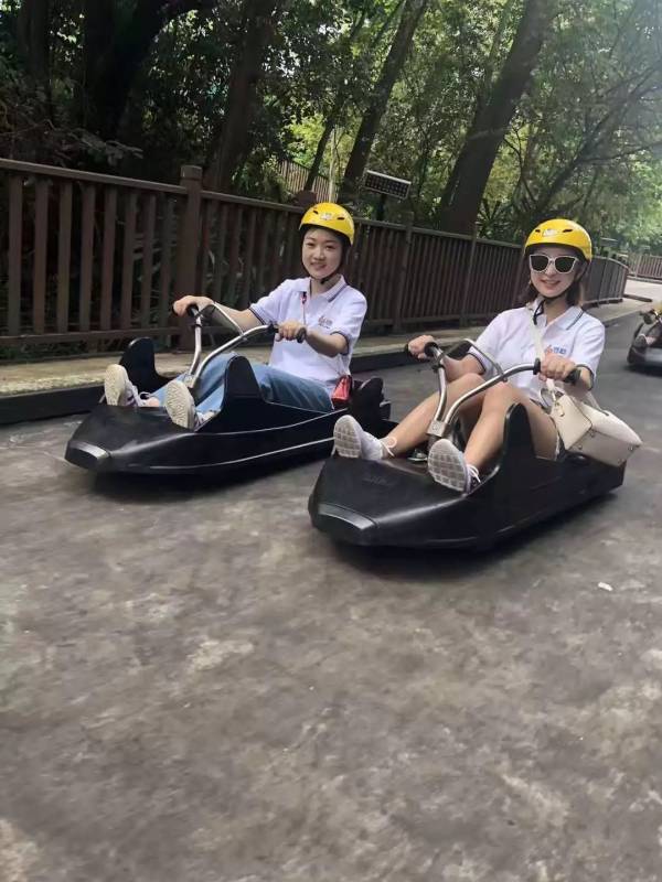 早上九点,大家前往圣淘沙岛,首先玩了当地著名的天际线斜坡滑车(Skyline Luge),从12层楼的高度沿着650米的蜿蜒跑道往下滑冲,享受乘风滑行的舒畅快意。