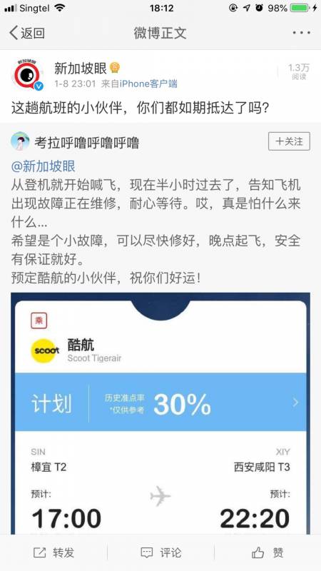 昨天(1月8日),飞往墨尔本的酷航TR24次航班,从樟宜机场起飞48分钟后因为飞机气象雷达故障,一个乾坤大挪移,原路返回了……