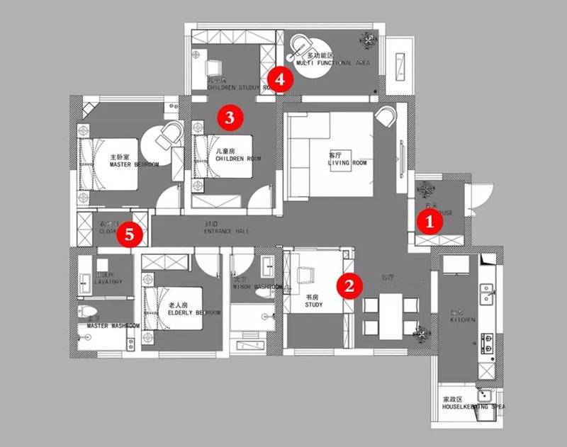 功能结构改造:1、为玄关腾出鞋柜位置,玄关到客厅之间的门洞向上平移了40cm;2、将餐厅与书房之间的墙体拆除,上方用玻璃隔墙,下方设立餐边柜;3、将儿童房与阳台之间的墙体拆除,扩大儿童房面