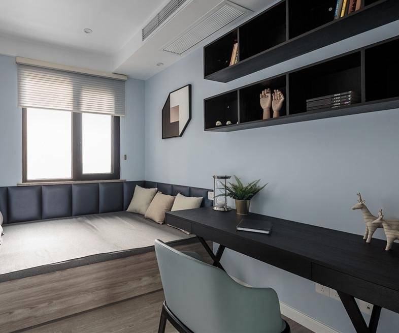 书房靠窗位置,采用榻榻米样式,一是可以满足业主工作之余,偶尔放松小休,二能满足基本客人留宿,三是利用榻榻米下方空间作为收纳区,可收纳不常用大件物品。榻榻米周围选用软包,符合人体靠墙舒适度的同时,软包设