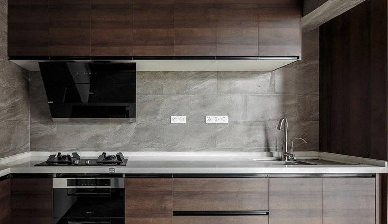 厨房橱柜材质选用胡桃木整体板,橱柜颗粒自然、纹路肌理明显搭配仿石材纹理亚光砖,厨房空间层次明显,且耐脏。餐厅