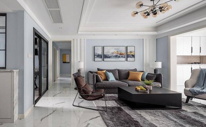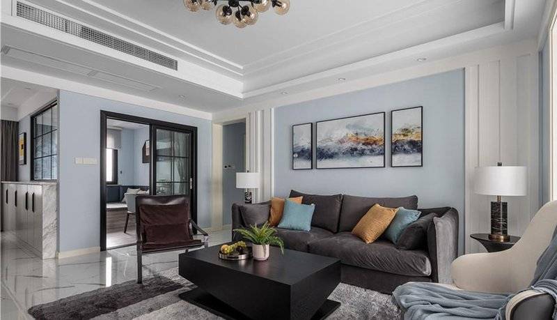 业主喜欢大方、明亮、有活力的空间,在客厅色彩搭配上选用蓝白色调,更加清新简洁,大量蓝白色的运用会使得空间视觉较轻,所以家具选用深色调,增加聚拢感,强调空间主题,搭配黄,蓝,绿,棕等软装色彩让空间更有活