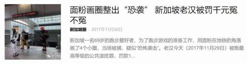 一名69岁的跑步爱好者,为了跑步游戏,用面粉在地铁的角落画了4个小圈,由于被怀疑可能进行“恐怖袭击”,他当场被捕。后被叛最高等级的公共滋扰罪,罚款1000新币。