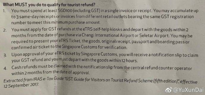 这一段翻译过来的话是“(消费者)必须当天单次消费100新元,(消费者)也可以从相同GST注册号的不同零售店累积最多3份当日收据或发票,以满足此最低购买金额”。