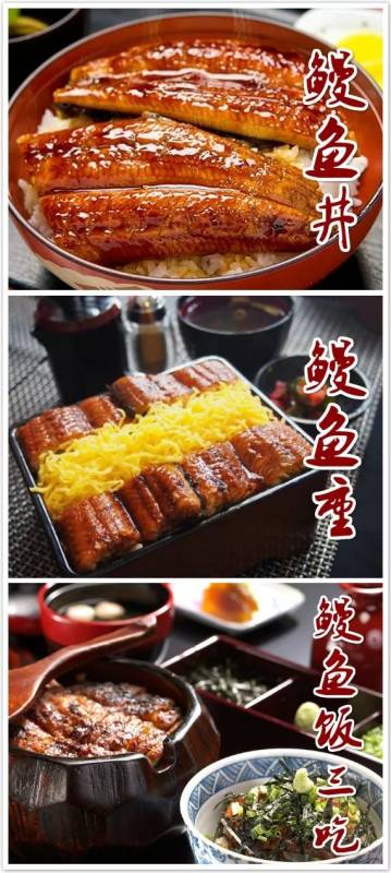鳗鱼饭的吃法一般分为三种:鳗鱼丼、鳗鱼重和鳗鱼饭三吃。大多数鳗鱼饭餐厅的午市会供应鳗鱼丼,用瓷碗装,一般鳗鱼丼的靠近头和尾比较薄身的部分。