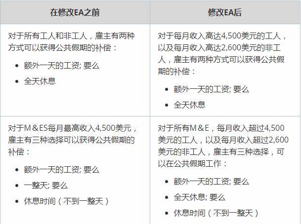 从2019年4月1日起,每月4,500美元的工资上限将被取消,从而将EA的覆蓋范围扩大到所有员工。这将使另外43万名M&Es员工受益,他们将享受至少7-14天的年假、带薪公众假期和病假、按时支付工资以及免受不当解雇的法定保护等核心条款。