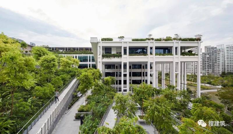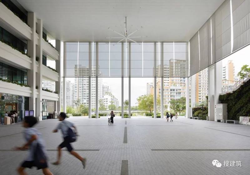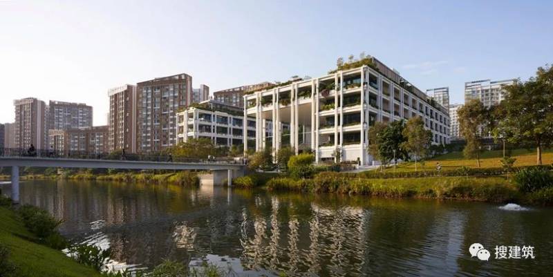 a large sheltered plaza facing the waterways embodies the heart of the community. programmed for a range of communal activities and events, this plaza serves as the main point of circulation throughout the site and from the adjacent railway station. every visible elevation is covered with lush planting. together with the veranda spaces that wrap around the restaurants and polyclinic, these plants act as an environmental filter between exterior and interior. the architecture is further characterized by an element of lightness and openness, allowing daylight and breezes to permeate and naturally ventilate the building.