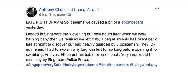 陈哲艺昨天在个人IG放上一张有机场警员看守一个黑色背包的照片,文中写到放婴儿用品的包包留在樟宜机场抵境厅,惊动警察,感觉像是营造了一场疑有爆炸物的虚惊。