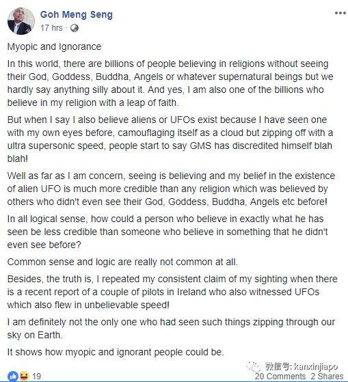 同样相信外星人存在的,还有新加坡著名前反对党领袖——吴明盛。他甚至自称见过UFO!