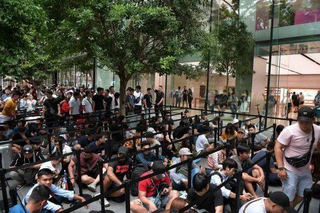 2018年9月20日,新加坡乌节路苹果旗舰店门前排队等候购买iPhone XS新品的果粉们席地而坐,等候进场购买。